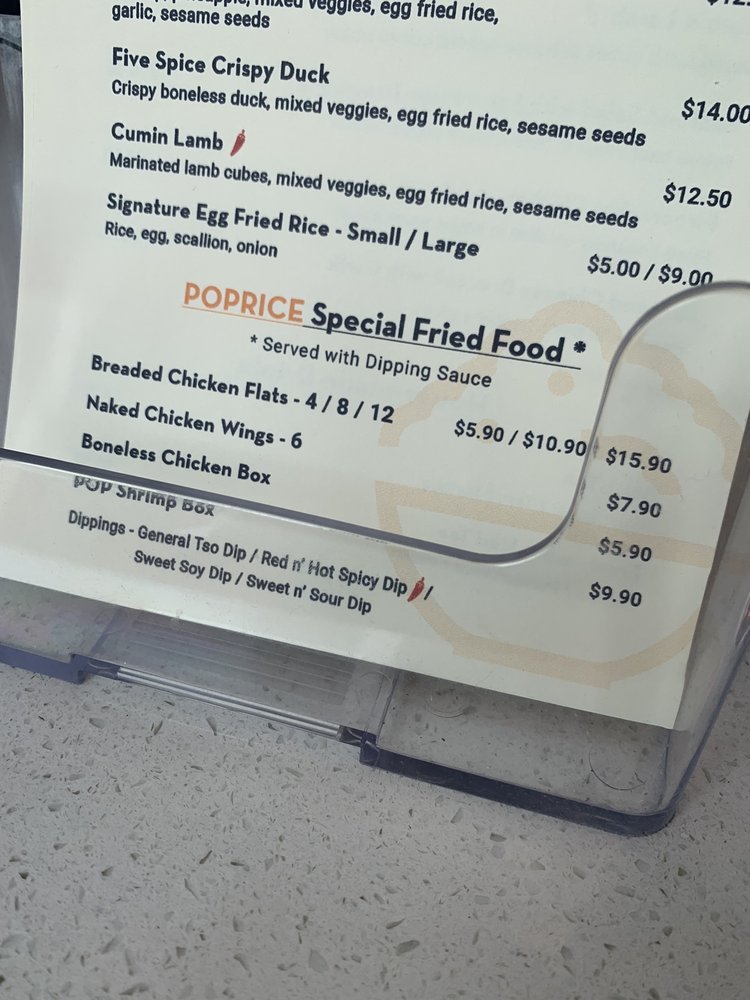 Offering a host of conveniences such as delivery, takeout, and outdoor seating, Poprice thrives on efficiency and enjoyment. Customers rave about the General Tso Chicken Fried Rice and Salt n Pepper Squid, which manage to blend rich flavors with quality ingredients. The dishes are often complemented by fresh vegetables, like crunchy broccoli and vibrant carrots, ensuring a delightful bite every time.